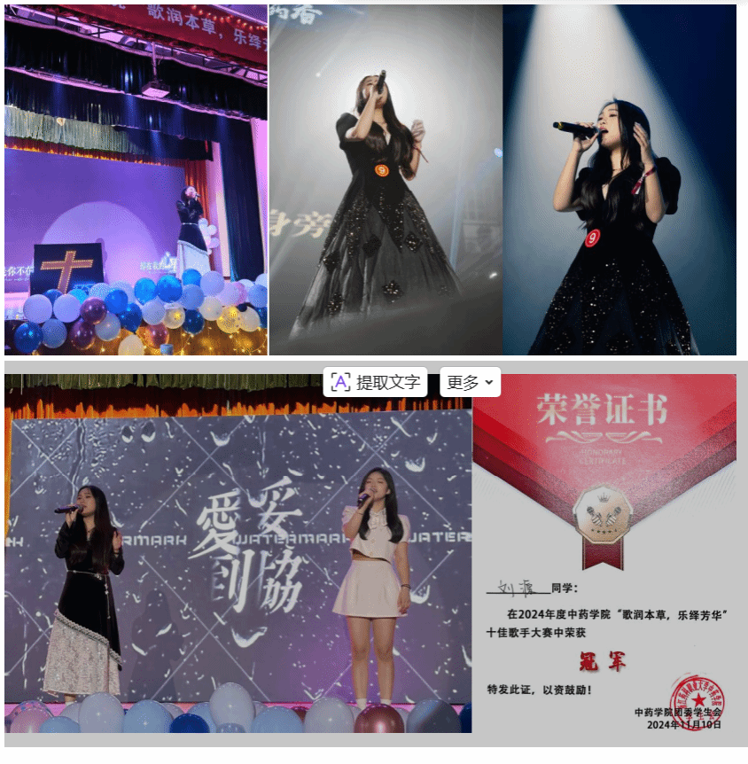 2024年中药学院“歌润本草,乐绎芳华”十佳歌手大赛上,她用清亮的嗓音征服全场,一举拿下冠军;随后站上校级第三届歌王争霸赛的舞台,不仅斩获第四名,更凭超高人气赢得“最佳人气奖”。舞台上的她,唱着青春的歌,传递着积极的能量;生活里的她,性格开朗,善于沟通,总能带动团队氛围——这份“全面发展”的风采,让“党员”的形象更鲜活、更贴近身边人。