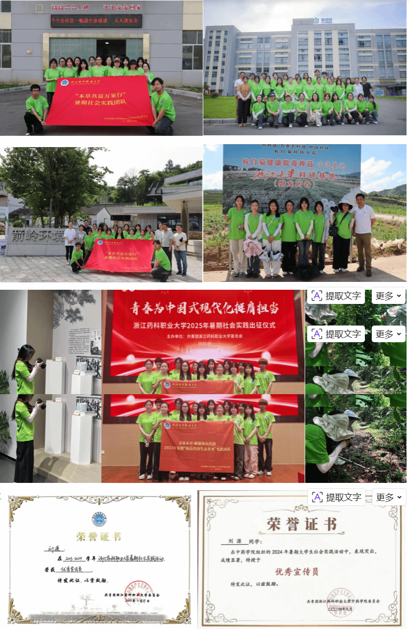 去年暑假,她随“本草共富万家行”团队深入奉化大堰箭岭村、磐安江南药镇,从药材种植田间到生产工厂,用镜头记录中医药产业链的每一环:拍了2000余张照片、100余个视频,制作实践推文阅读量超500,还积极向校报、校外媒体投稿,让更多人看见基层中医药的活力。凭借这份认真,她获评校、院级“优秀宣传员”。今年暑假,在奉化尚田梅山她同“梅山药韵生态普查实践团”穿梭于青山绿水间,精心普查、拍摄照片、查找资料,编制梅山道地药材基原植物图册,为药材资源保护与开发提供可视化依据。此前她还带队调研杭丽嘉地区中药老字号的项目,也拿下了学院寒假社会实践一等奖。每一次走基层,她都把“服务”二字揣在心里,做得扎实又温暖。