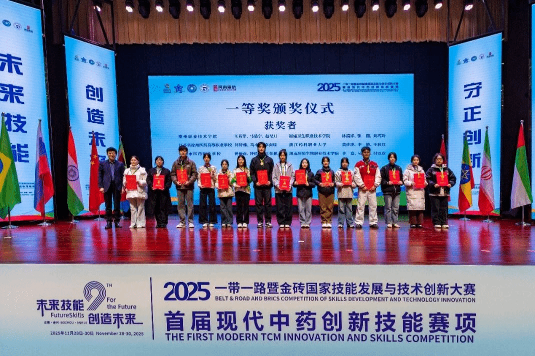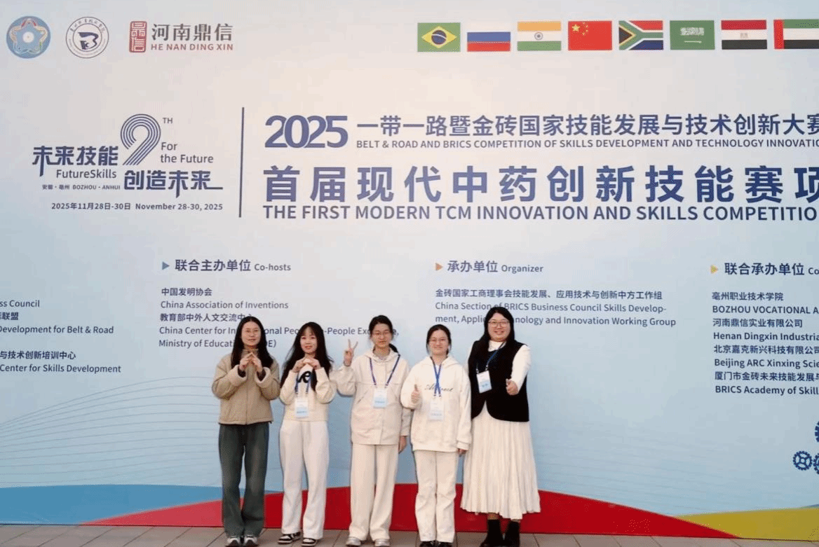 2025年11月29日,2025年“一带一路暨金砖国家技能发展与技术创新大赛首届现代中药创新技能竞赛”在安徽亳州圆满落幕。代表我校参赛的中药学院师生黄佳琪、李楠、王彩红、沙秀秀(指导教师)、刘诗行(指导教师)凭借扎实的专业知识、娴熟的操作技能和出色的临场发挥,从来自全国60所医药院校的优秀学子中脱颖而出,荣获大赛一等奖、“最佳组织奖”,沙秀秀、刘诗行还获评“优秀指导教师奖”。