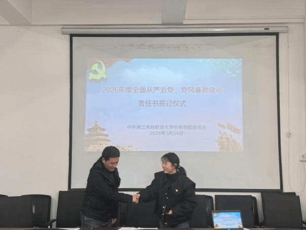 为进一步压紧压实学院党委在党风廉政建设、意识形态、安全稳定及师德师风建设等领域的主体责任,努力为学院教育教学事业高质量发展提供坚强的政治保障。2026年3月24日,中药学院党委在学院会议室举行2026年度全面从严治党、党风廉政、意识形态、安全稳定、廉洁从教等相关责任书签订仪式,学院全体教职工出席签订仪式。