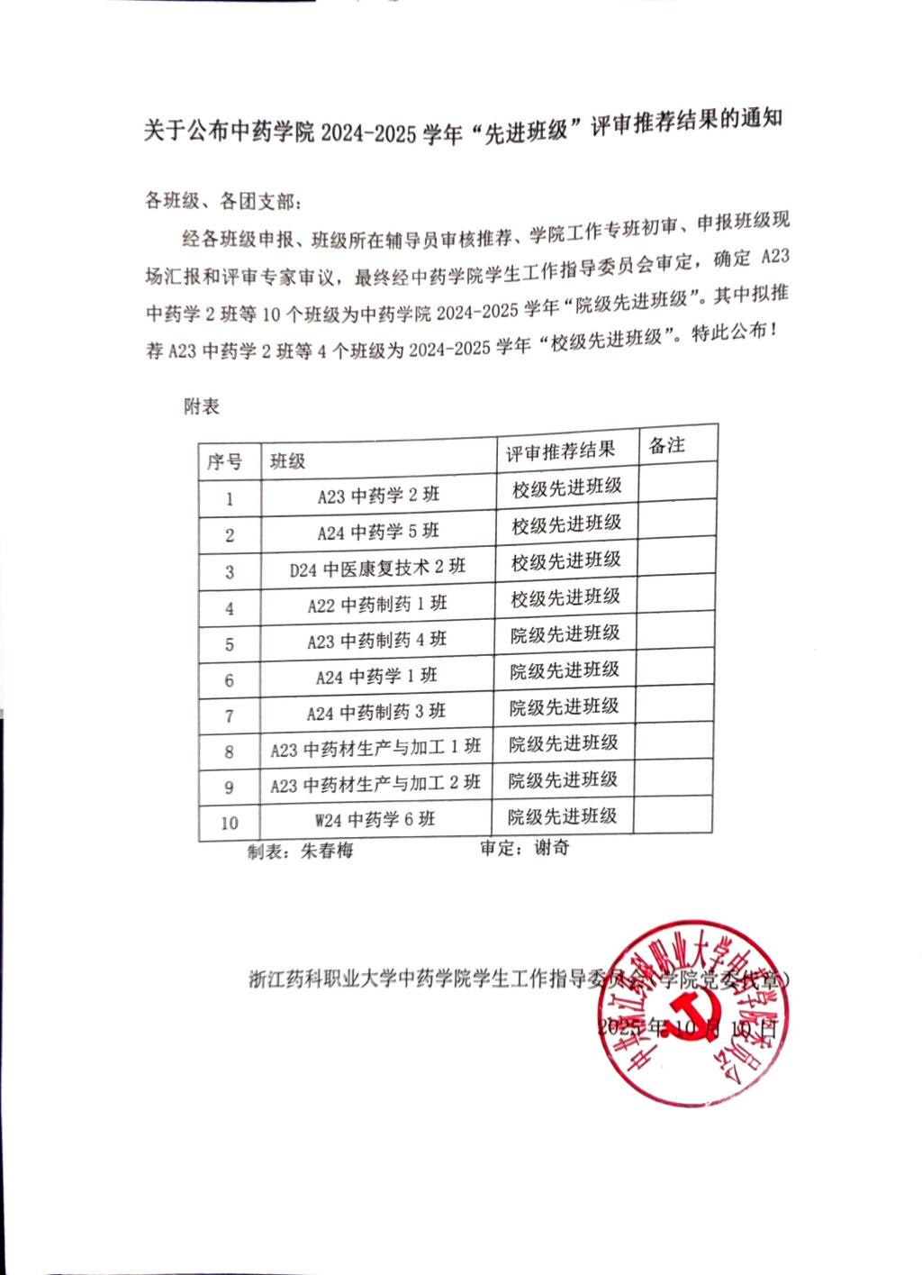 关于公布中药学院2024-2025学年“先进班级”评审推荐结果的通知