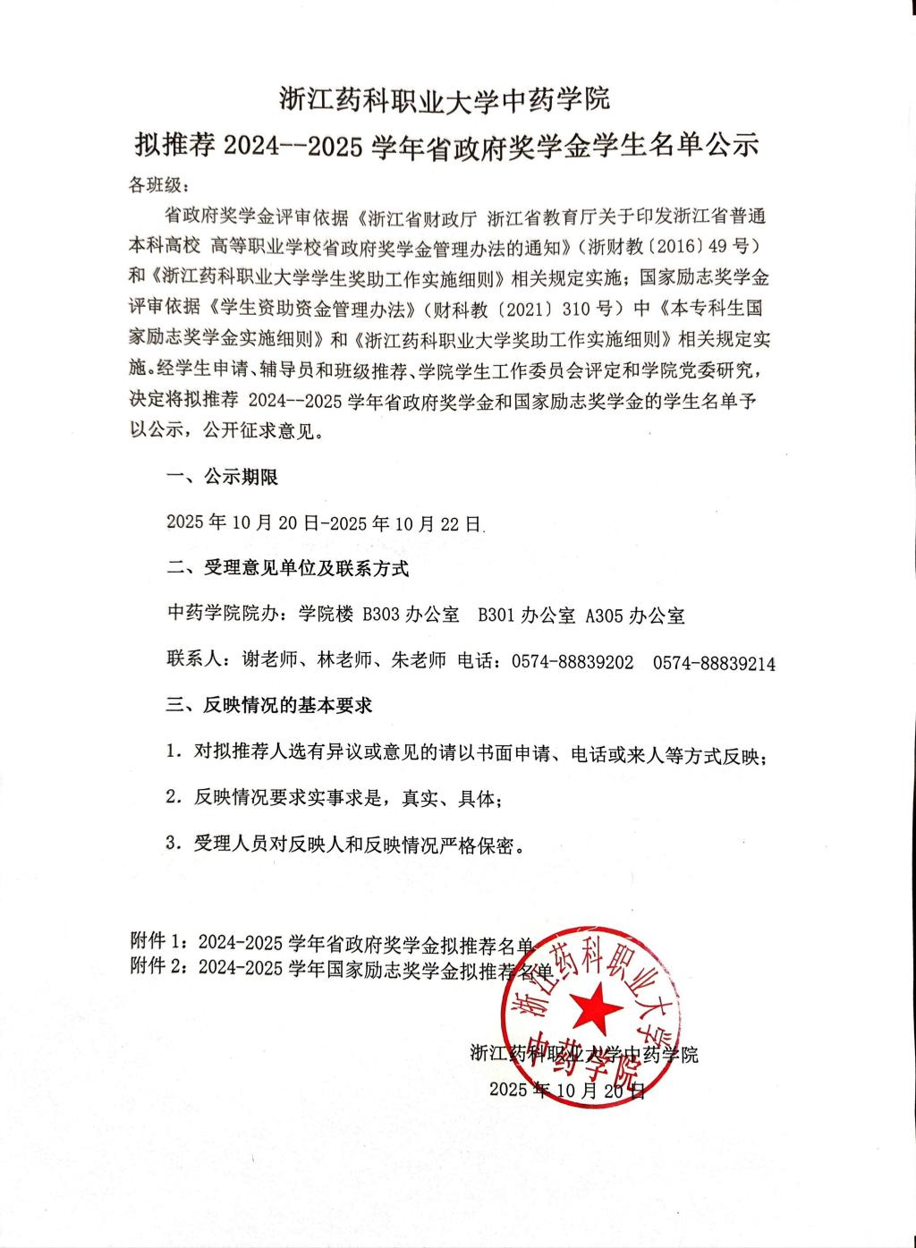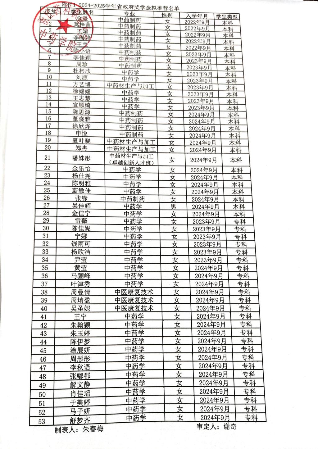 浙江药科职业大学中药学院拟推荐2024-2025学年省政府奖学金学生名单公示