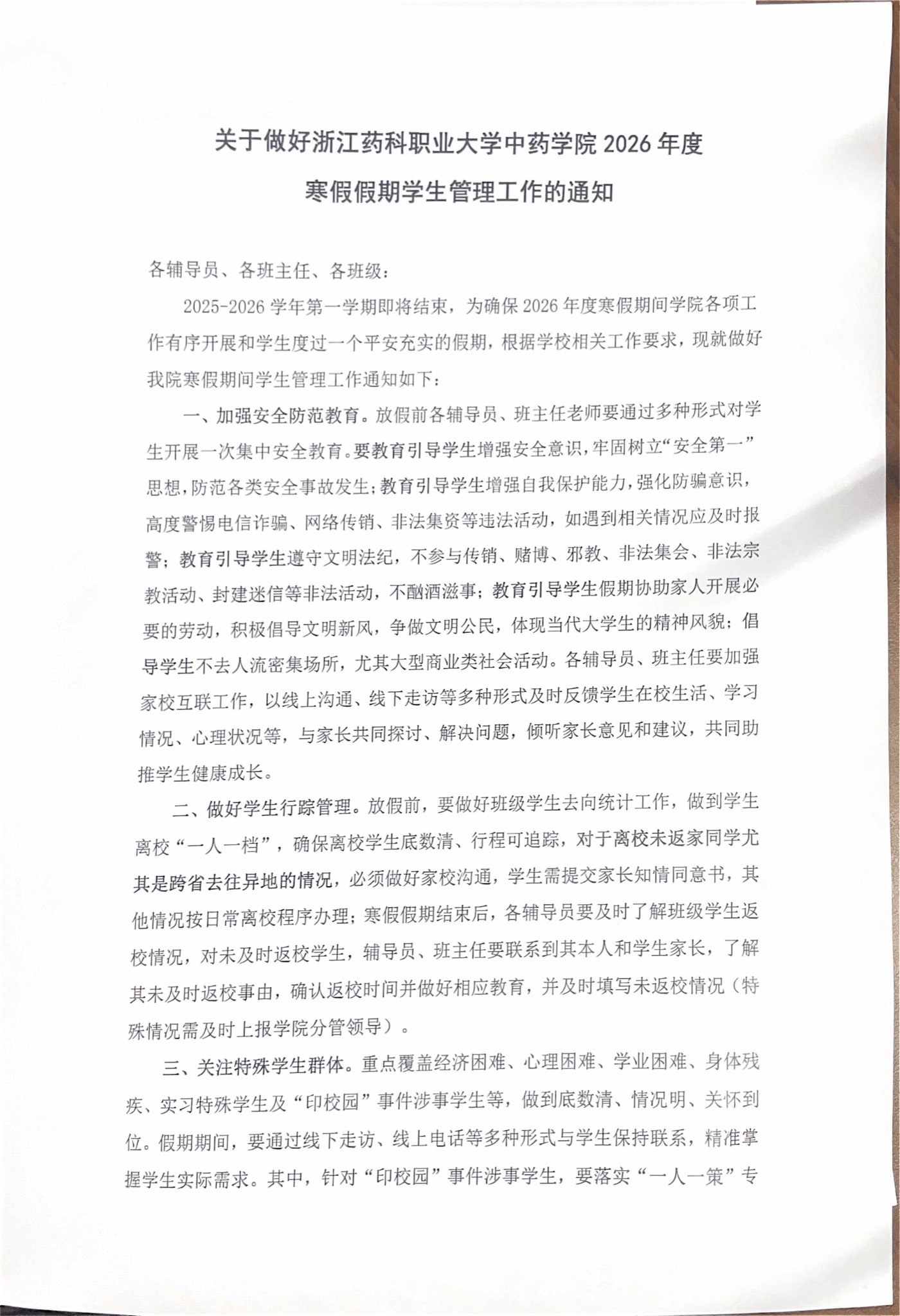 关于做好浙江药科职业大学中药学院 2026年度寒假假期学生管理工作的通知